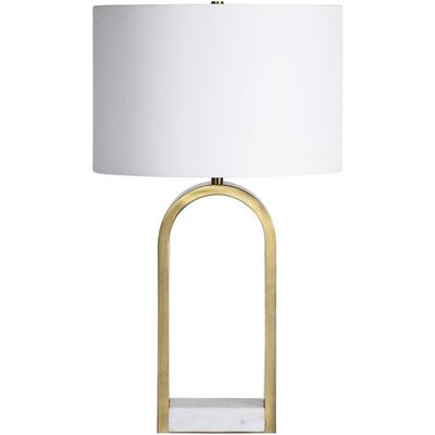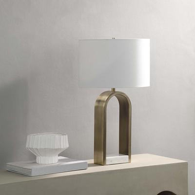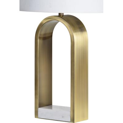 Radiant even when unlit, this table lamp exudes a transfixing beauty upon all elements in its midst. Composed of marble and antique brushed brass plated iron, this table lamp has an architecturally inspired structure that brings dimension diversity into the living room. Set on a living room side table, this piece pairs well with strong furnishings in neutral or vivid hues.