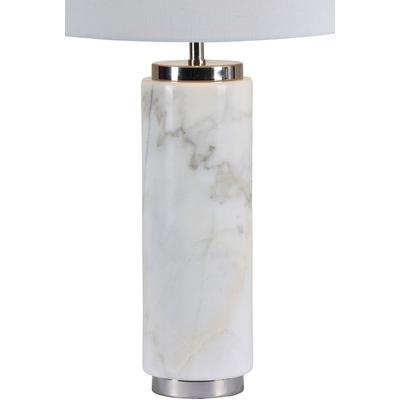 The stately design of this modern table lamp feels statuesque on tabletops throughout the home. A white marble lamp base adds the perfect element of antiquity without feeling old fashioned, thanks to a satin nickel-plated accents and off-white linen drum lampshade. Soft gray veining throughout the base makes this natural stone lamp is a graceful addition to grand interior spaces.