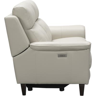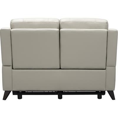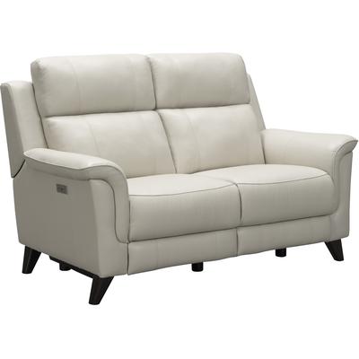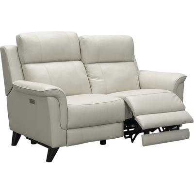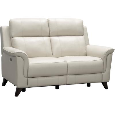 Mid-century modern elevated reclining loveseat with power recline and power headrests. This loveseat features box seat style pad over chaise seating with pocketed coil springs, tucked pillow arms, and clean line pub backs. Power buttons have USB ports to keep your devices charged. Legs are finished in a dark teak color.